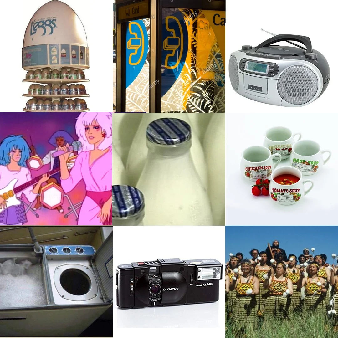 28. L'Egg's 29. Ringing Telecom to make a collect call 30. Sitting by the radio waiting to record your favourite song 31. Jem and the Holograms 32. Glass milk bottles 33. Soup Mug 34. Twintub 35. Film Cameras 36. Poi E - Patea Maori Club