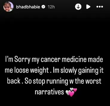 "I'm sorry my cancer medicine made me lose weight. I'm slowly gaining it back," she wrote. "So stop running with the worst narratives."