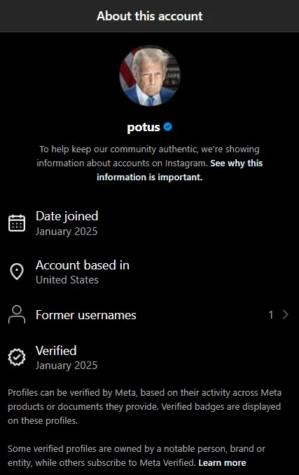 If you check the “About This Profile” section for both @POTUS and @VP, it shows these accounts joined the platform in January 2025 as new profiles with one prior username.