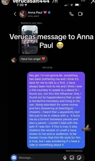 Given that this man is supposedly the father of a well-known and wealthy influencer, this didn't seem to add up, prompting Veruca to share her feelings online.