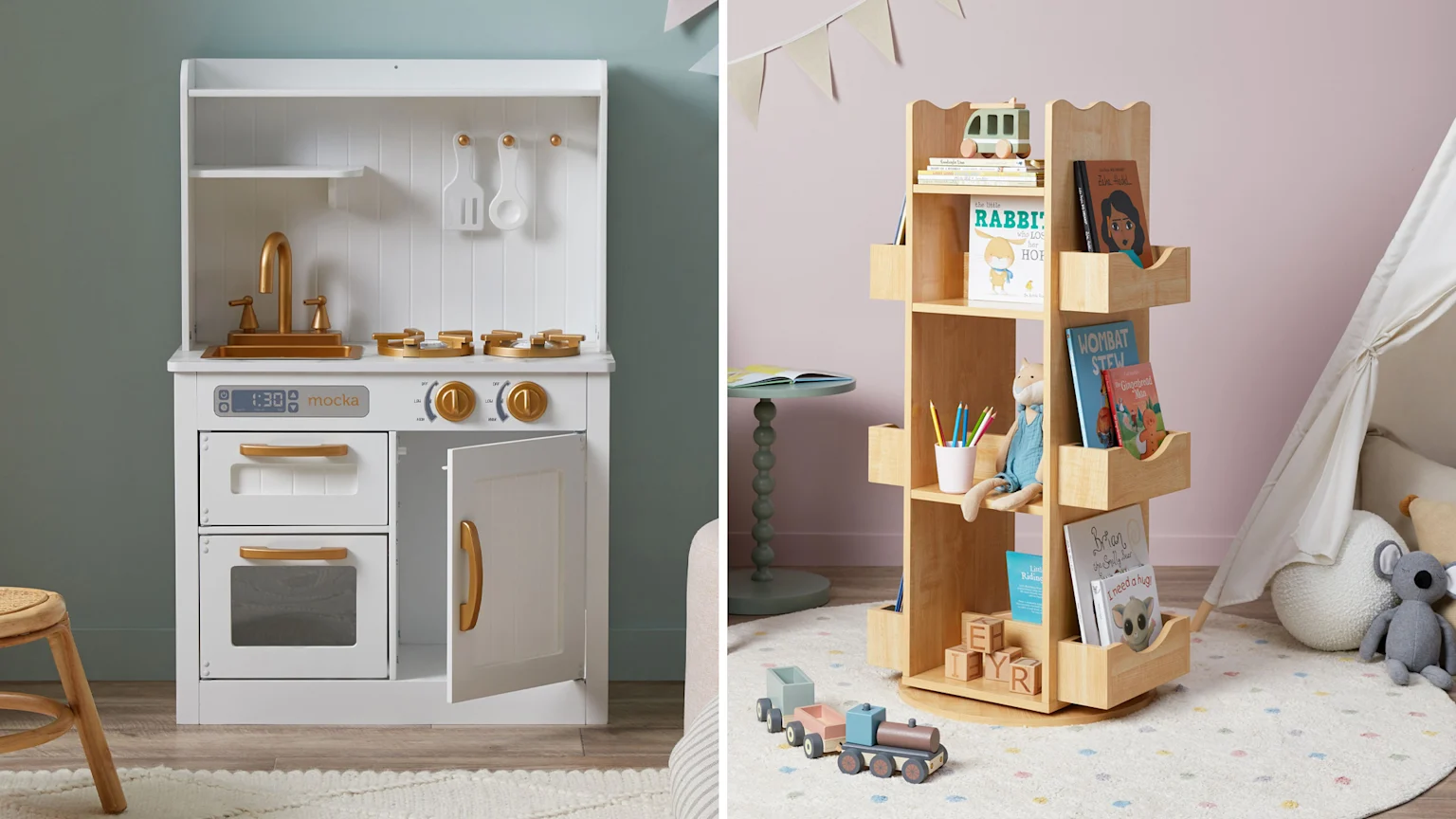 With the Wooden Baby Play Gym for sensory stimulation, the Play Vanity and Kids Hampton Kitchen, and the Theo Rotating Book Shelf, hours of fun are bound to be had.