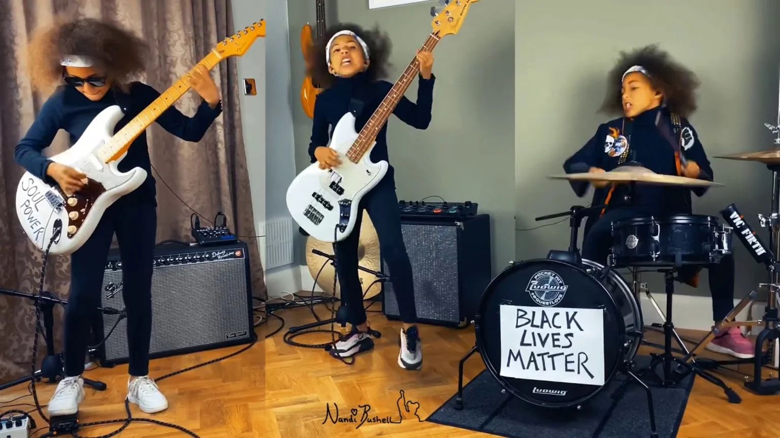 In her most recent video upload, Nandi is playing not just drums, but also guitar and bass to Rage Against The Machine's excellent track, Guerilla Radio.