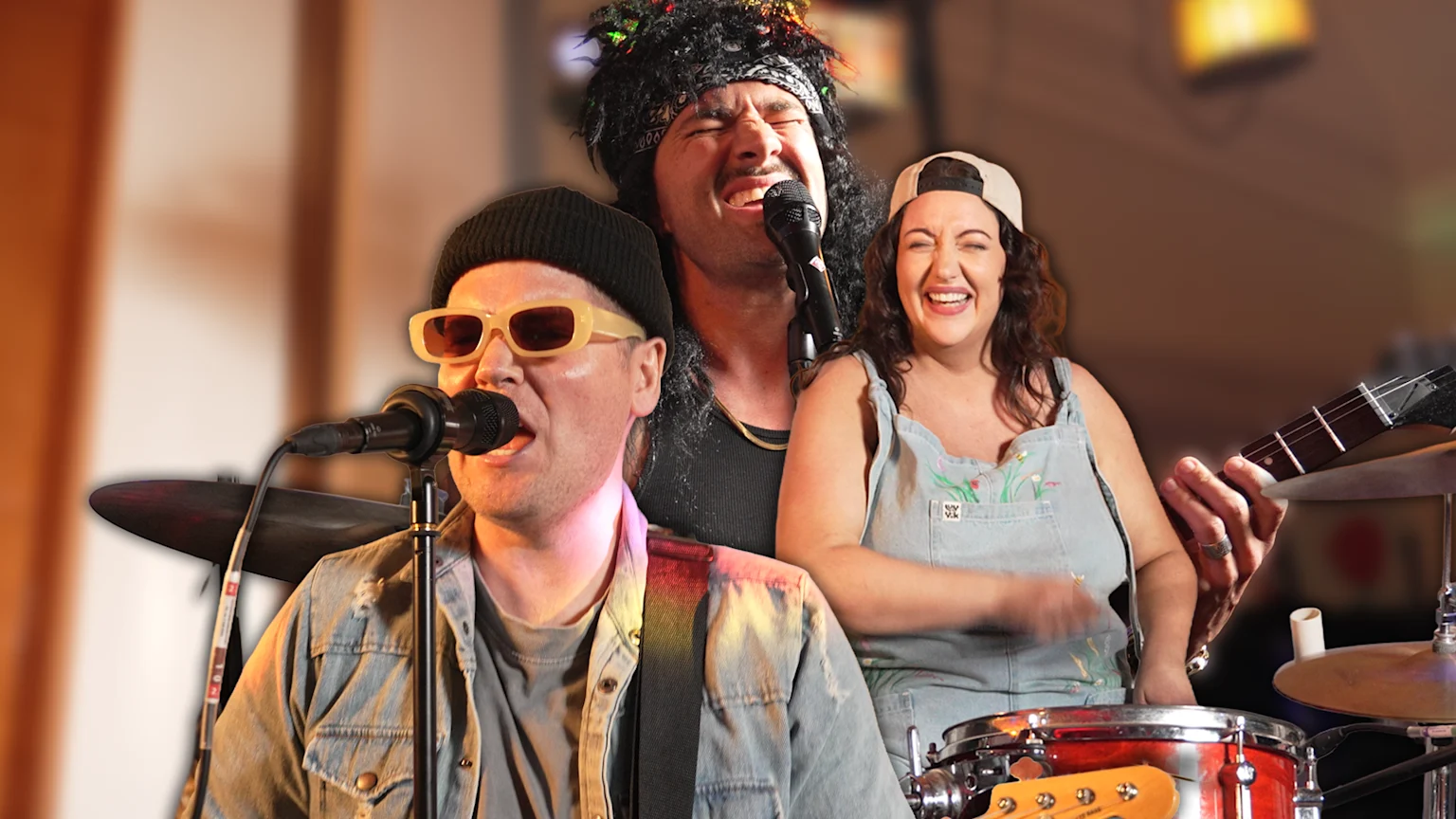 Armed with instruments from MusicWorks and dressed in some iconic rockstar costumes, the trio committed to daily practice. Meg took her place on the drums while Clint and Dan tackled the guitar (with varying levels of success). They even auditioned in front of Mitch James himself… but were promptly told no.