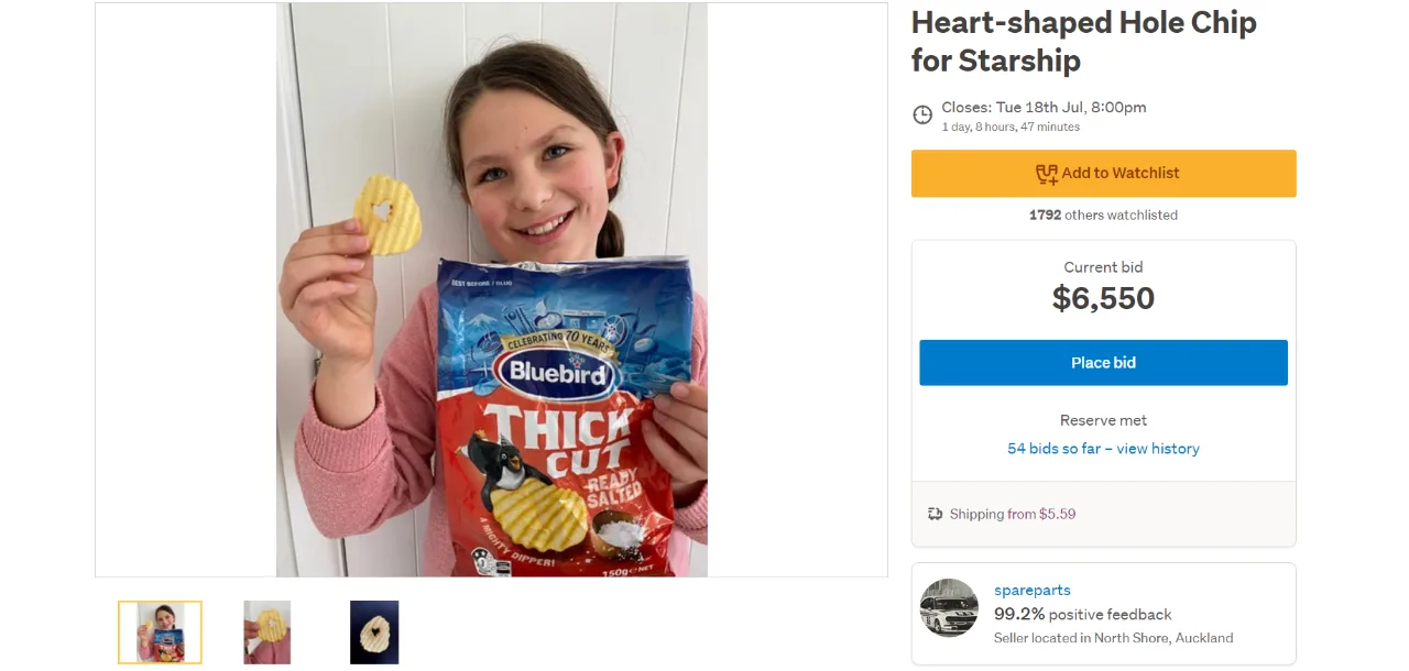 So, if you're feeling chipper and fancy yourself a one-of-a-kind chip, head over to Trade Me and join the bidding war for Bianca's heart-shaped chip.