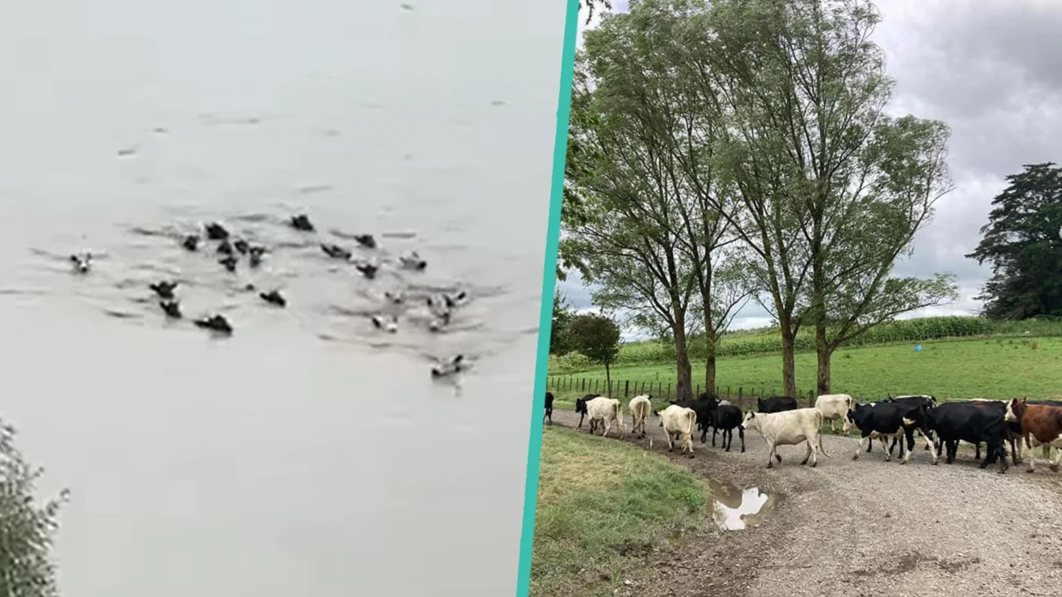 A heartwarming video of cows in flood water following their owner's voice goes viral