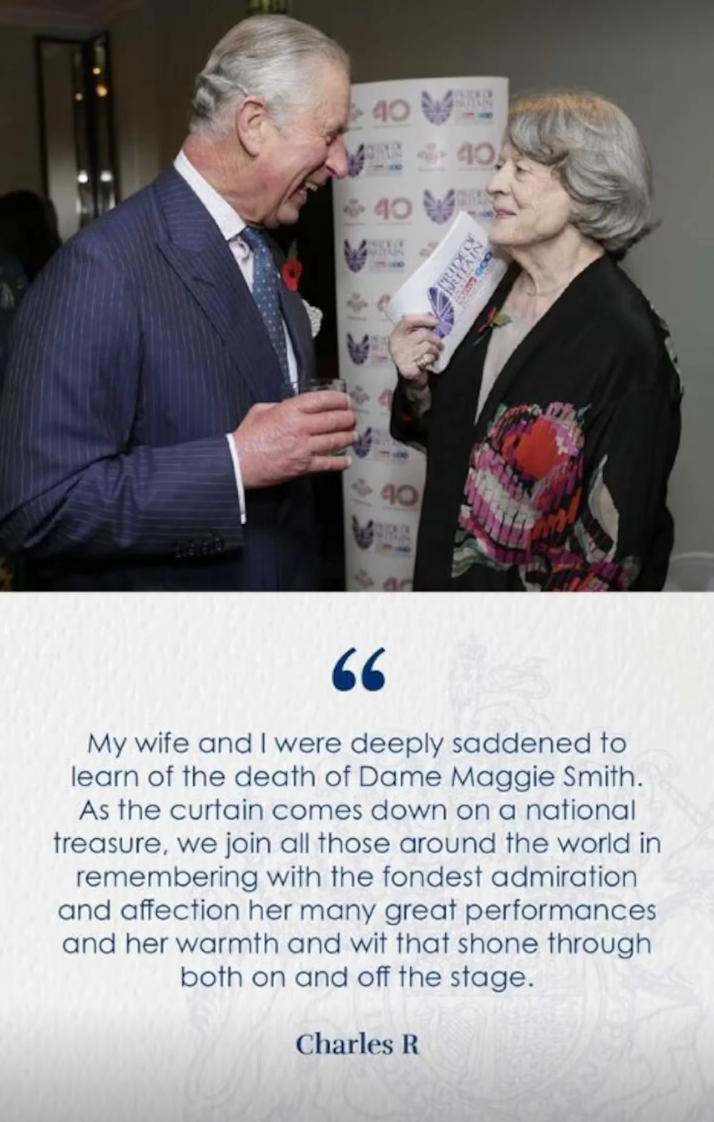 "As the curtain comes down on a national treasure, we join all those around the world in remembering with the fondest admiration and affection her many great performances, and her warmth and wit that shone through both off and on the stage," they said in a statement.