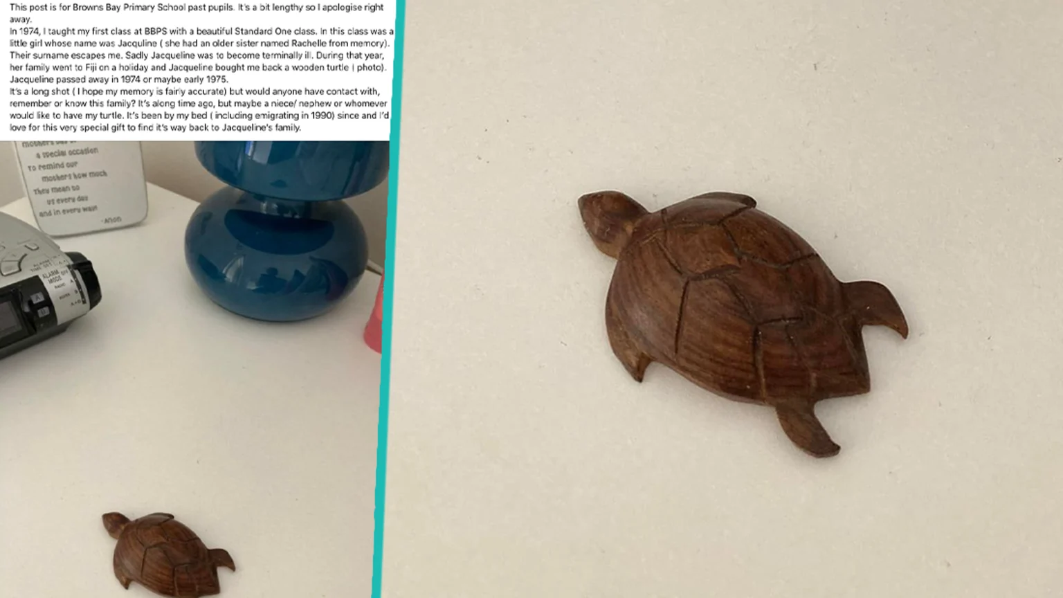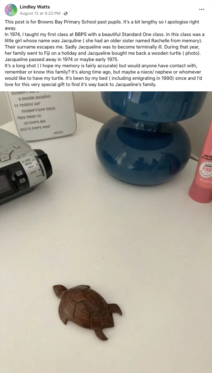The Facebook post had a photo of a wooden turtle that her late student, Jacqueline had gifted her back in 1974.