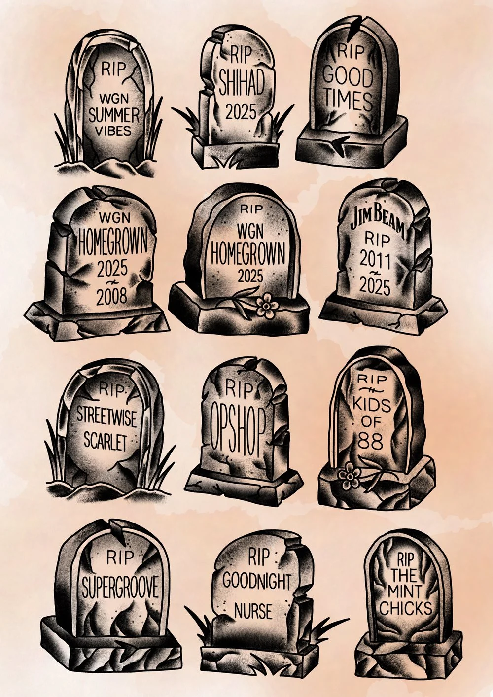There's also the word 'chur', a hand throwing the goat and an actual kiwifruit, but maybe the most eye-catching are the tombstones, sending 'Rest in Peace' messages to some pillars of Kiwi music.