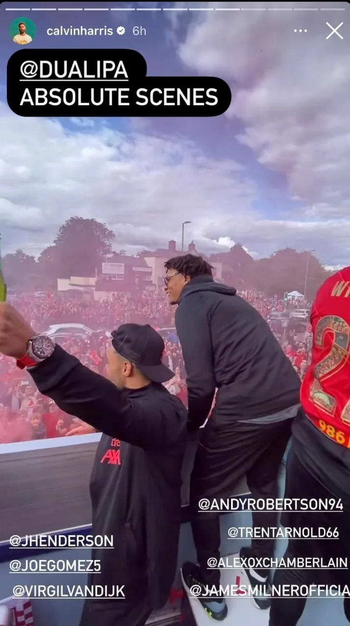 The vibes seemed absolutely impeccable as the Liverpool faithful packed the streets around the bus and danced along to the tracks pumped out by the Scottish DJ, including 'One Kiss' made by him and Dua Lipa. The 'How Deep is Your Love' producer shared the "absolute scenes" on his Instagram story, tagging the players that were partying with him.