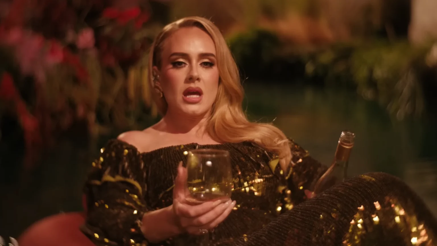 Adele gloriously floats down lazy river holding a glass of wine in new music video