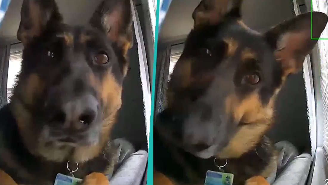 He blinks and seems very confused probably looking at the device moving on its own. The confusion on the face continues and the adorable head tilts follow along right after.