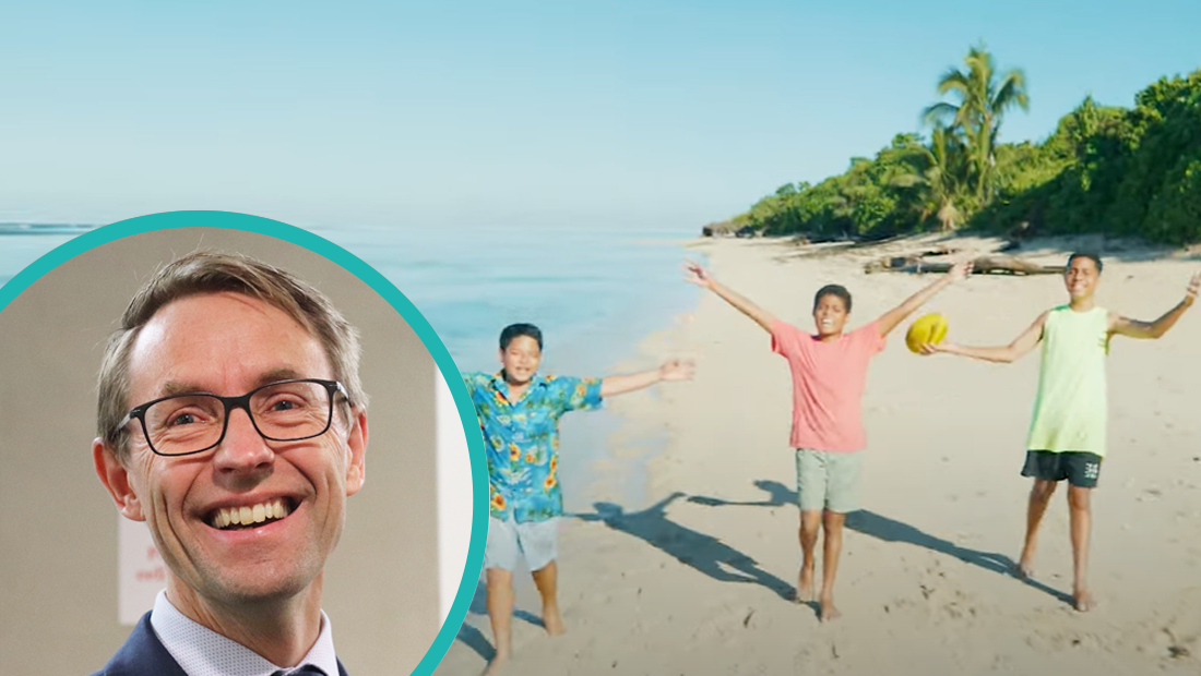 The video shows 6-year-old Ratu Isikeli Sauturaga telling Dr Ashley that the country's traffic-light system is "a lot more relaxed" as he sips a traffic light mocktail, and Mohammed Zoheeb invites him to enjoy a much-needed shot of vitamin D on their shores.