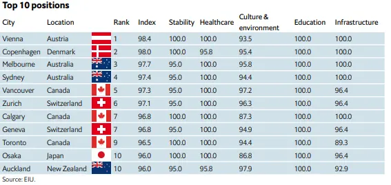 Vienna, Copenhagen, Melbourne, Sydney and Vancouver are the top five most liveable cities, respectively, according to the publication. Zurich, Calgary, Geneva, Toronto and Osaka make up the rest of the top ten (Osaka and Auckland are tied at #10).