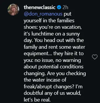 “Put yourself in the family’s shoes: You’re on vacation, it’s lunchtime on a sunny day. You head out with the family and rent some water equipment… they hire it to you, no issue, no warning about potential conditions changing,” the ‘Fancy’ hitmaker wrote.