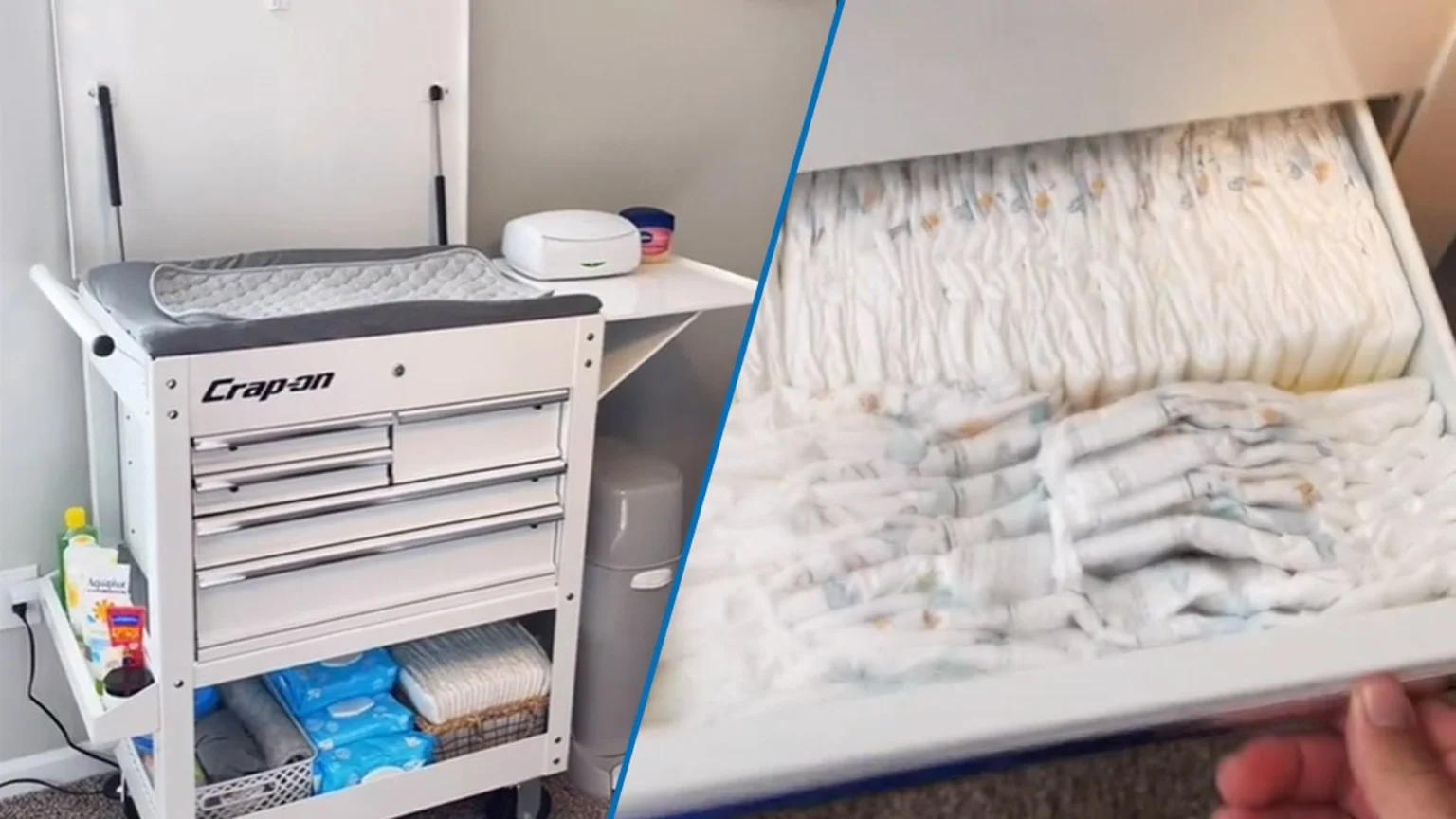 Meanwhile, a side shelf had his son's "butt" accessories such as ointments and lotions. Each drawer contained other essentials like bibs, onesies and swaddles.