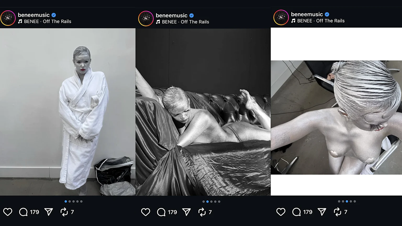 Kiwi singer Benee has switched up her usual look for something a little more shiny - full silver body paint.