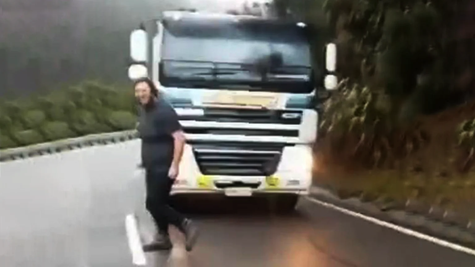 Kiwi comradery has come in the form of a bloke using his car to tow a much larger truck up a hill, all while it's pissing down.
