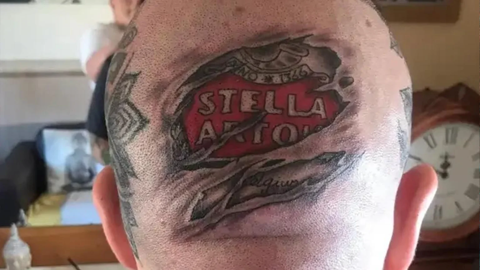 Bloke gets full-size Stella tattoo on the back of his head because his mate dared him