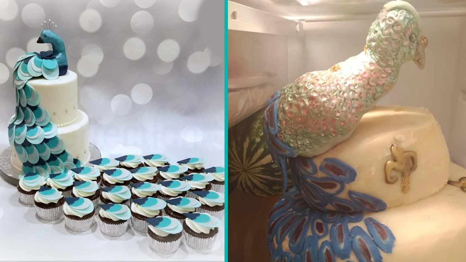 The cakemaker was initially contacted by the bride to recreate an elaborate peacock cake, which had its tail cascading down multiple tiers and fan out into individual cupcakes: