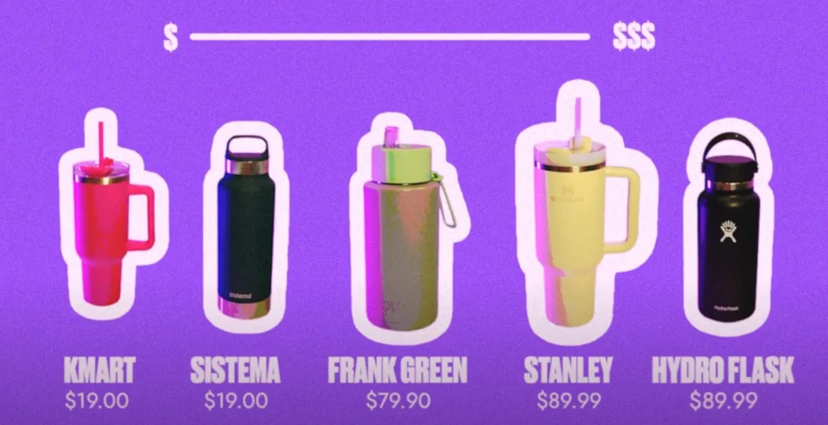 We bought five drink bottles ranging in price from $19 to $90 - A Kmart dupe of the viral cup, a Sistema bottle, Frank Green, Hydro Flask and of course the all-important Stanley.