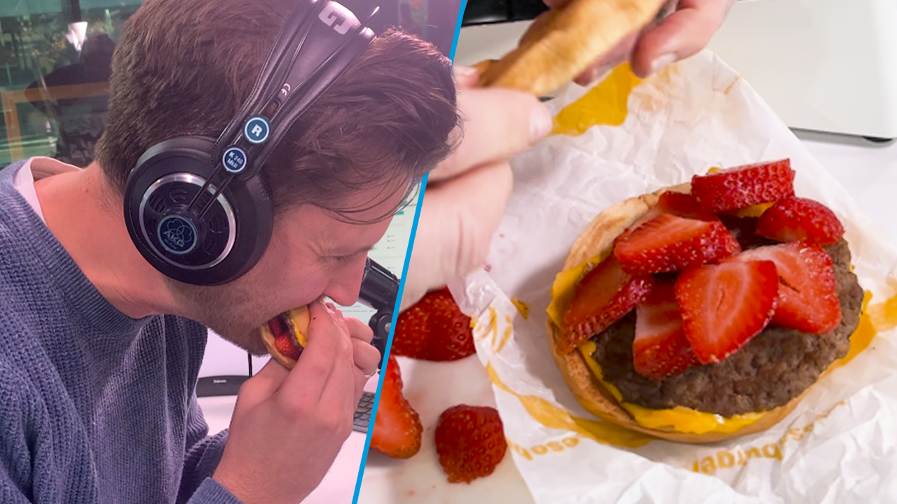 Taking a big bite of the strawberry cheeseburger, his face looked shocked when he realised the combination was far better than expected
