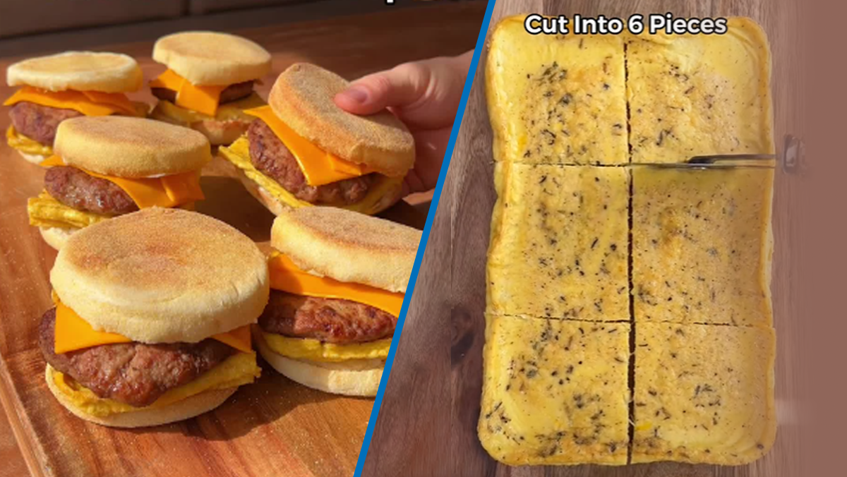 All six eggs are then combined, seasoned, whisked together, and poured into a baking dish to cook in the oven for 5 to 7 mins.