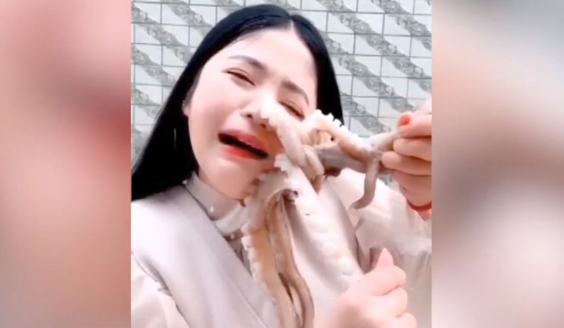 A Chinese blogger has come off second best after trying to eat a live octopus while live streaming the whole ordeal.