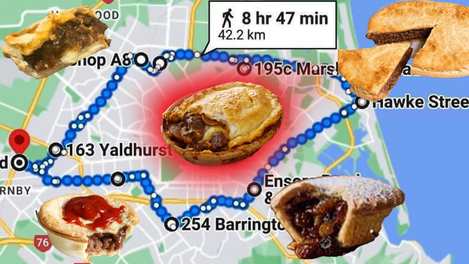 The next day Biz posted a follow-up complete with photos of the fellas at each stop as well as their time and route. It took them just under 8 hours to travel the 43.36kms, smashing back 6 pies, a sausage roll, a donut, and a raspberry slice in the process.