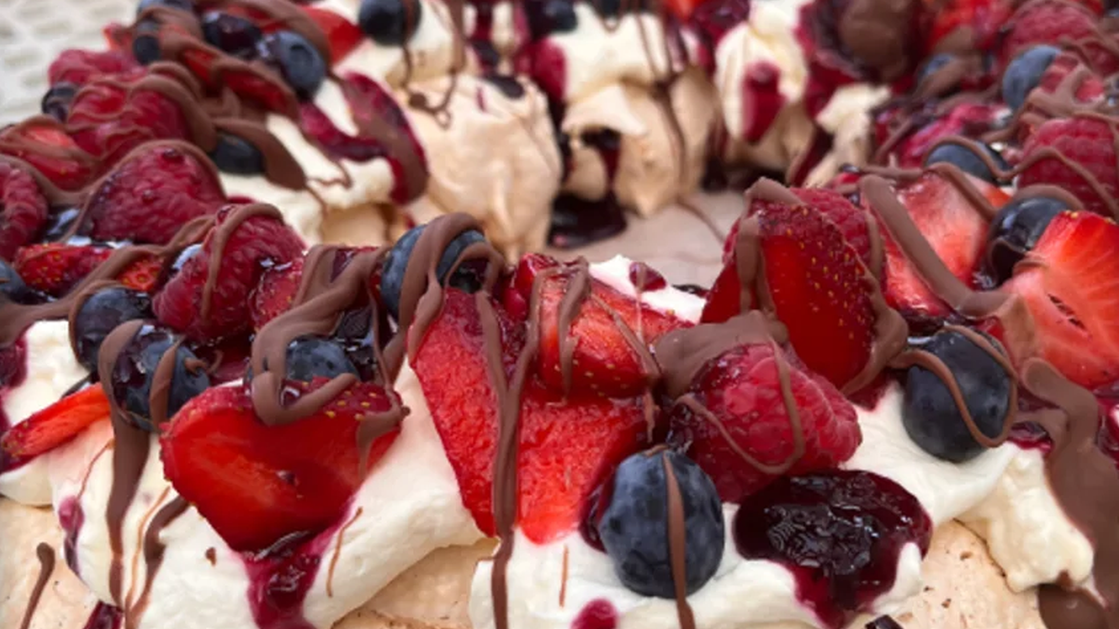 - Separate 7 eggs and keep the whites in a bowl. - Get out your electric beater and start beating! Adding 1 tablespoon of caster sugar every 20 seconds (you're going to need 340 grams all up). - Take your time here, don't rush! - Add 1 ½ teaspoons of white vinegar. - Spread it all out on a baking tray in the shape of a wreath and cook for 90 minutes at 130 degrees. - Leave it to cool and then decorate with all of your faves! I love using fresh berries, bits of chocolate and a berry coulis!