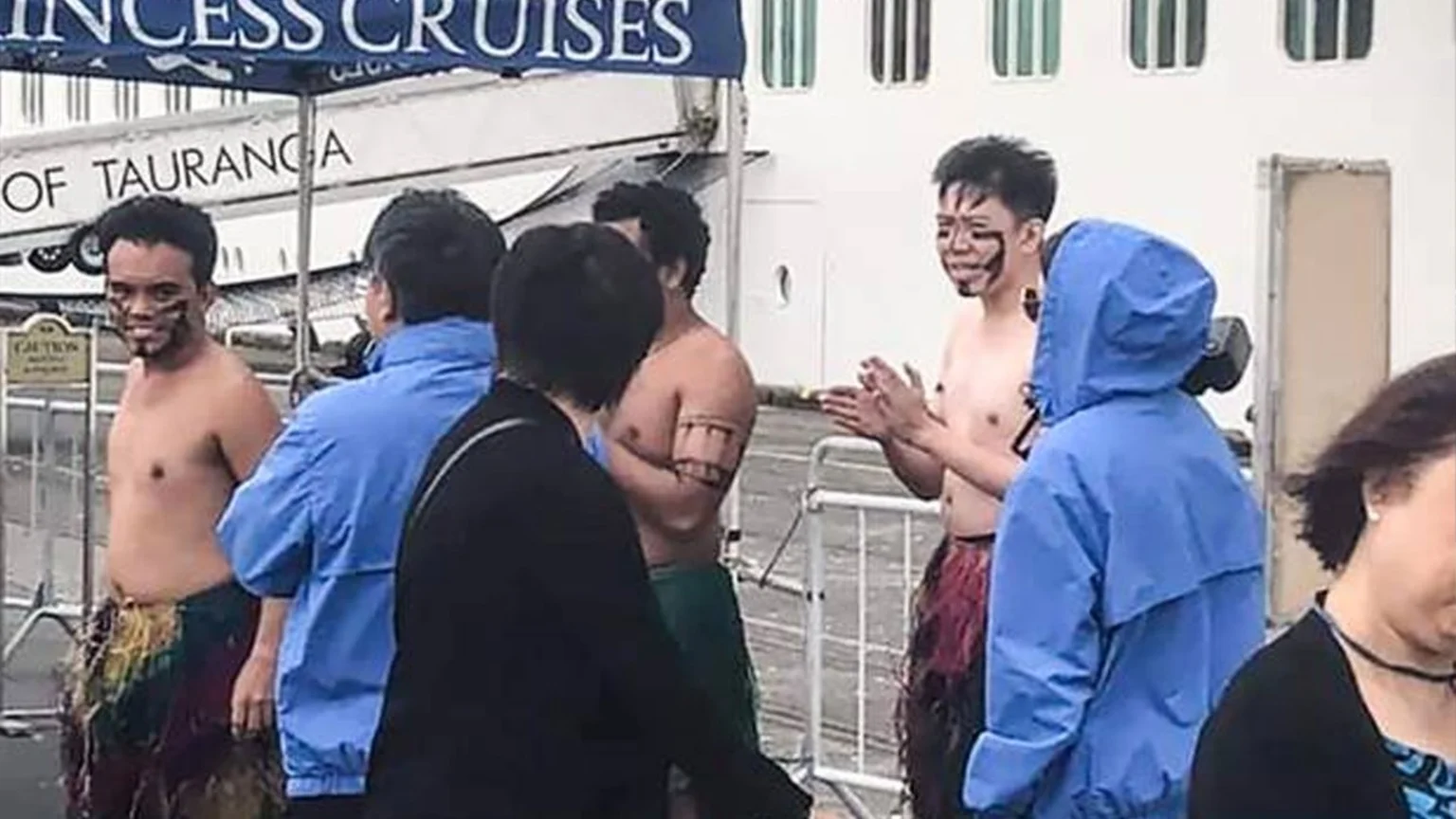 In the pictures, a group of men appear to be presenting a powhiri to cruise ship passengers as they arrived at the Port of Tauranga on Monday morning.