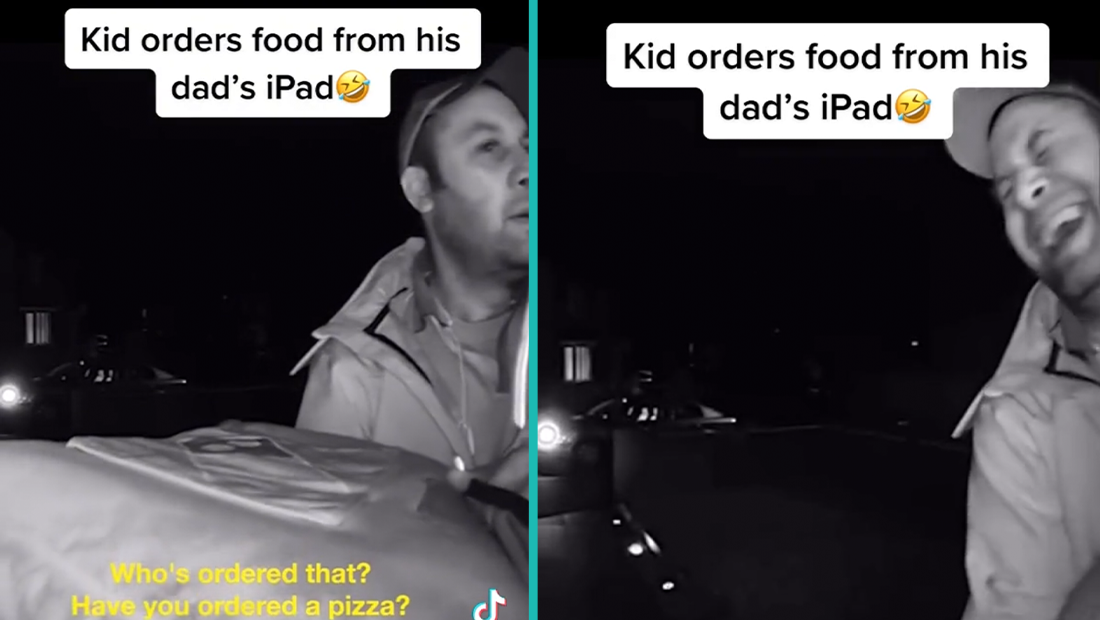 In the video, dad is confused and can be heard asking around in the house, " Who's ordered that? Have you ordered a pizza?"