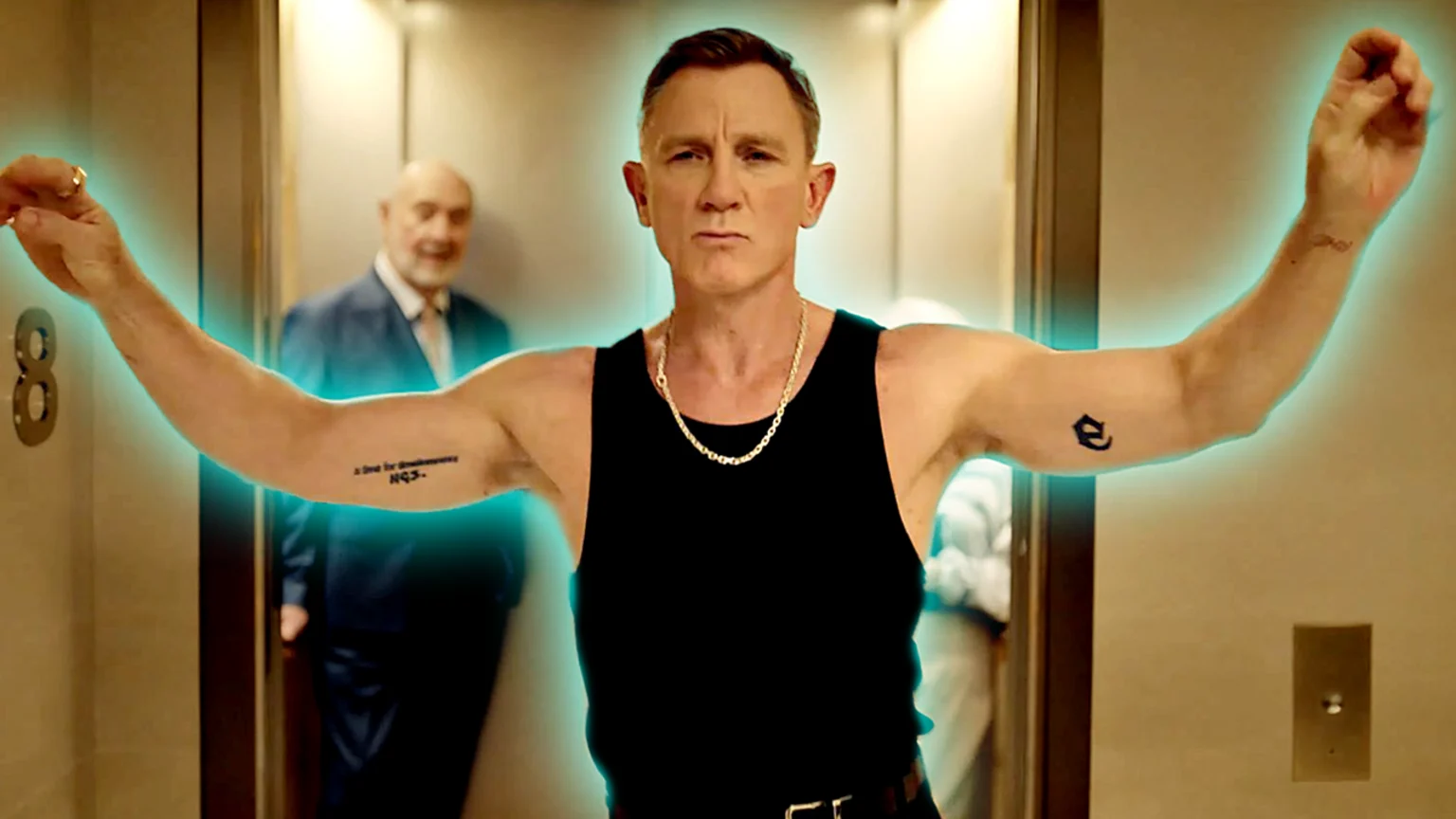 The James Bond icon is later seen thrusting his hips in an elevator while completely disregarding the elderly couple behind him who are trying to get to their room. However, based on their expressions, it's clear that they were enjoying the show - I would too.