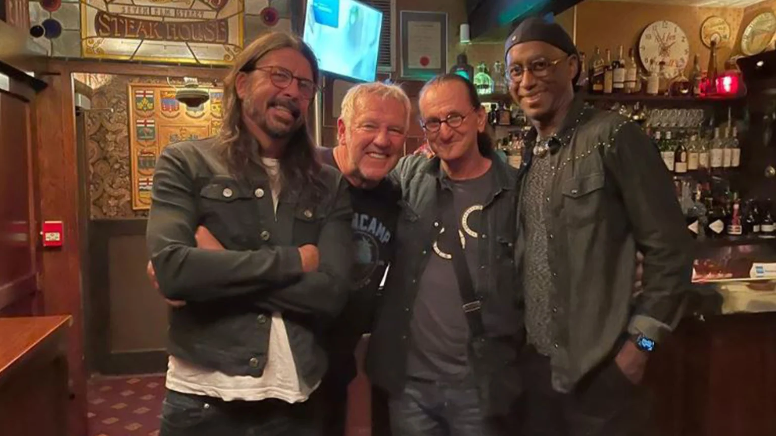 The Foo Fighters' frontman was pictured with Geddy Lee and Alex Lifeson from Rush, as well as the lesser known but just as talented drummer Omar Hakim.