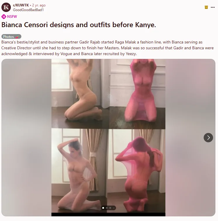 Before she was recruited by her future husband's brand Yeezy, Bianca was a Creative Director for a fashion label called Raga Malak started by her friend, stylist and business partner, Gadir Rajab.
