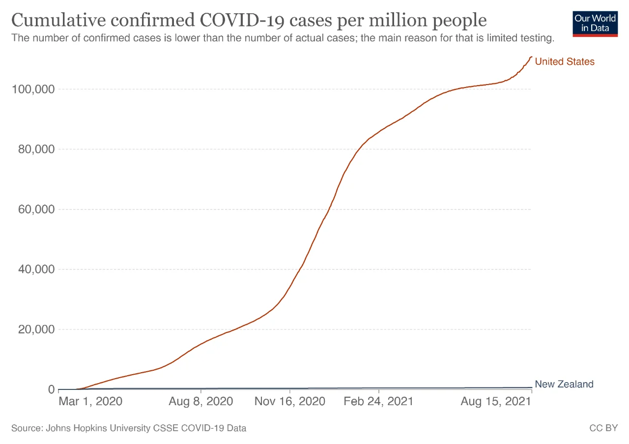 Let's be real, 2,879 total cases in New Zealand compared to the USA's 35,076,720 is impressive in itself however, we can't compare a pebble to a rock so let's have a look at the statistics per million.