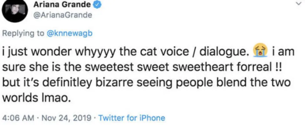 Ari caught wind of the whole impersonating situation, and let's just say she wasn't the biggest fan. Reacting to the videos, she tweeted: "I just wonder whyyyy the cat voice/dialogue. I am sure she is the sweetest sweet sweetheart for real!! But it's definitely bizarre seeing people blend the two worlds, lmao."