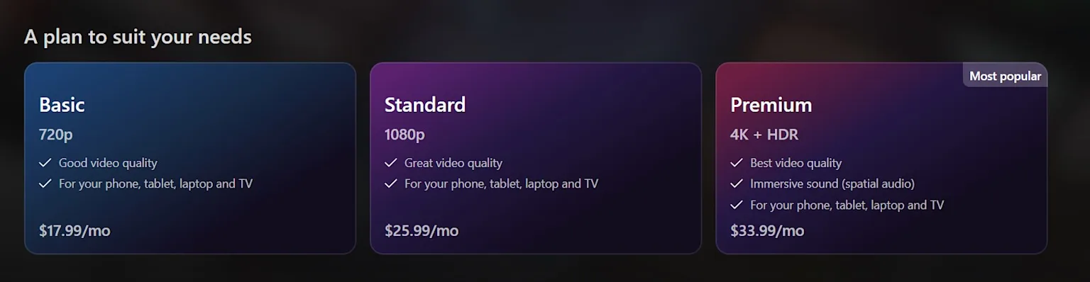 Netflix's basic subscription has jumped from $14.99 to $17.99 a month, the standard $20.99 plan is now $25.99, and the premium option has jumped from $27.99 to $33.99.