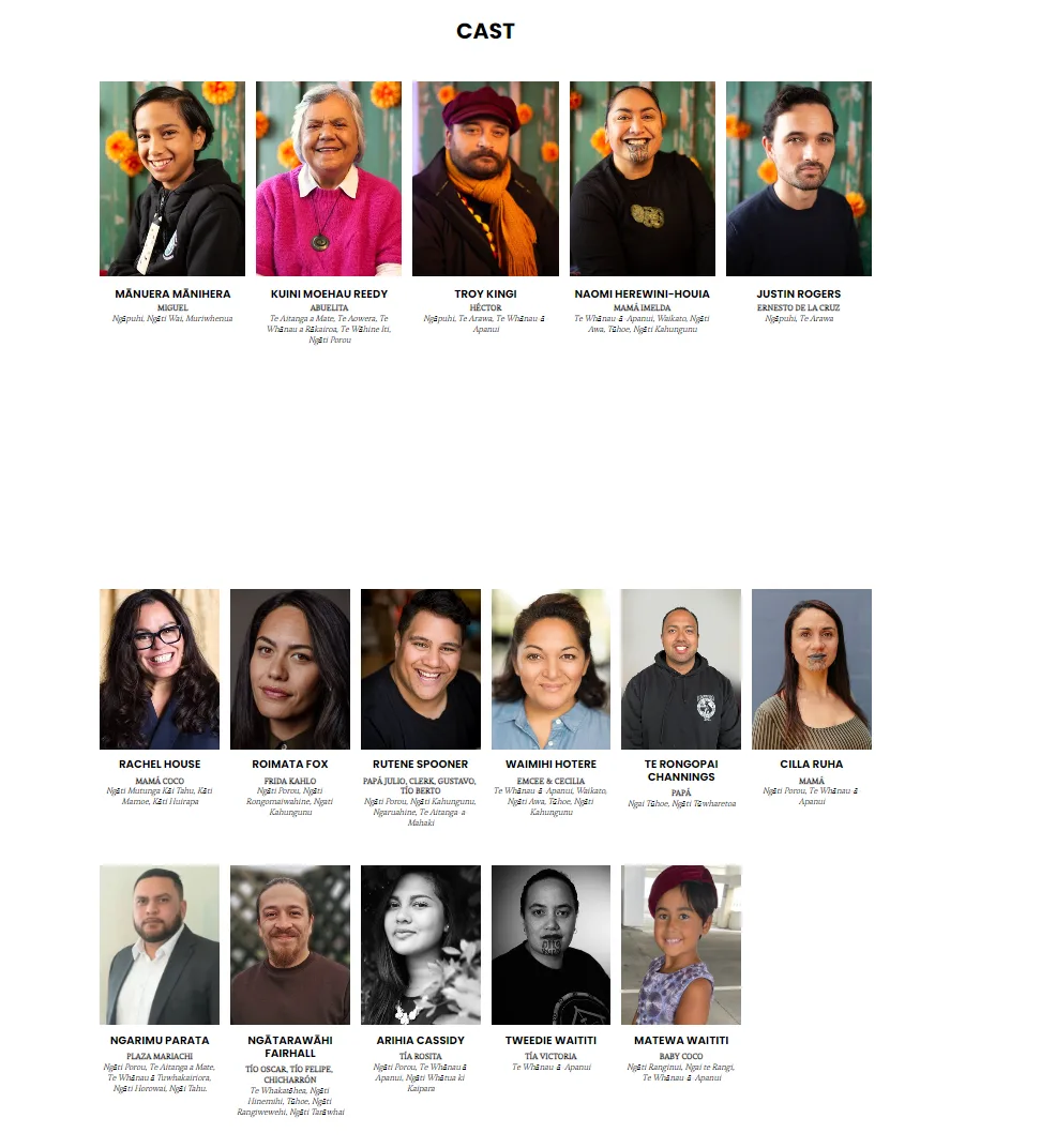 There are three returning actors from The Lion King and Frozen Reo Maori. Justin Rogers will play Ernesto de la Cruz, Arihia Cassidy is Tía Rosita and Rutene Spooner voices three different roles including Miguel's late great-grandfather - Papá Julio.