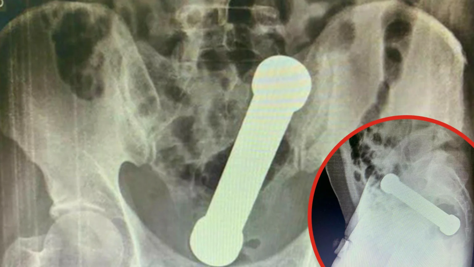 After X-rays were conducted, doctors found the 20cm -long-dumbbell wedged in where the colon meets the rectum. Ya can't miss it.