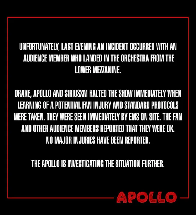 Not long after, a representative for the Apollo ensured the man wasn't seriously hurt and Drake returned to the stage.
