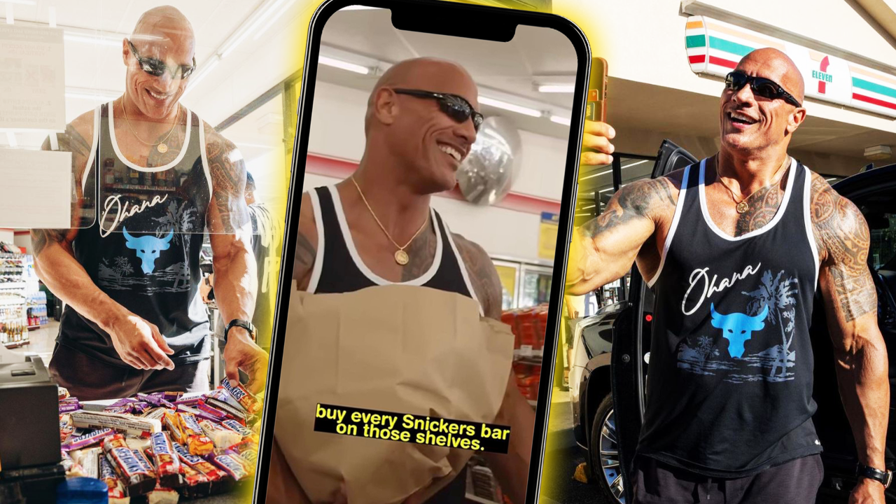 "Where's the Snickers?" he asks the clerk, who directs him to the chocolates. The Rock then grabs literally every Snickers on the shelf, takes them back to the clerk, and buys all of them.
