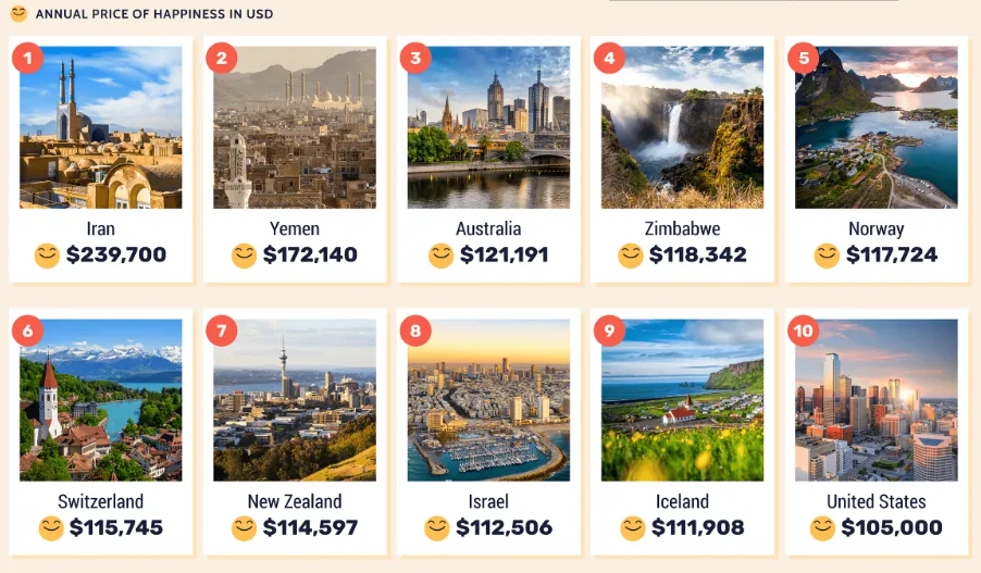Overall, NZ has the 7th highest price of happiness in the world. Iran is at #1 ($405,000), then it goes Yemen ($291,000), Australia ($205,000), Zimbabwe ($200,000), Norway ($199,000) and Switzerland ($195,000).