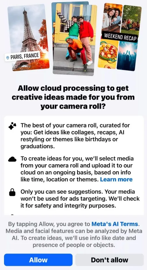 The tool asks if you’ll allow “cloud processing” of your camera roll - basically, it wants permission to upload your camera roll to its cloud so its AI can scroll through and spit out suggestions like collages, birthday throwbacks, or themed posts.