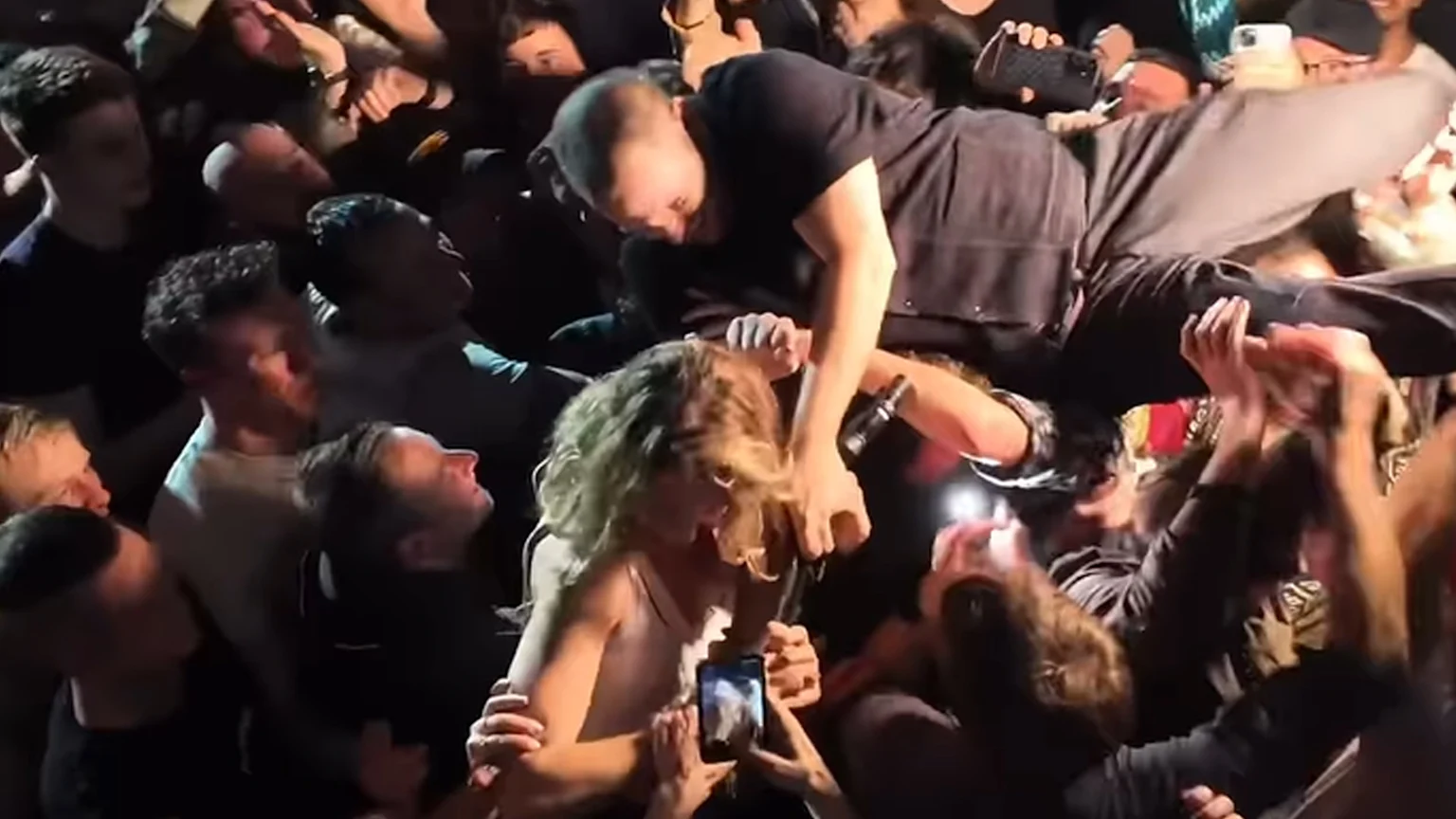 In a video captured by another concertgoer, Skinner is being held above the mosh pit by excited fans when one woman grabs hold of his shoe and refuses to let go.