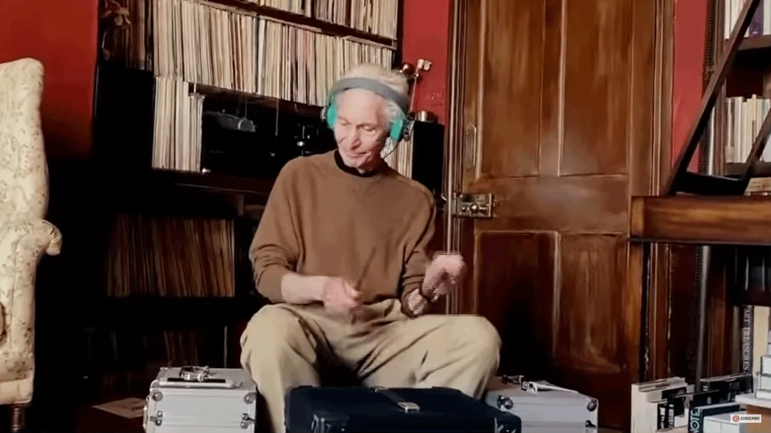 Joining bandmates Mick Jagger, Keith Richards and Ronnie Wood, Watts decided to substitute his drums for a couple of boxes and invisible cymbals while performing in his home studio.
