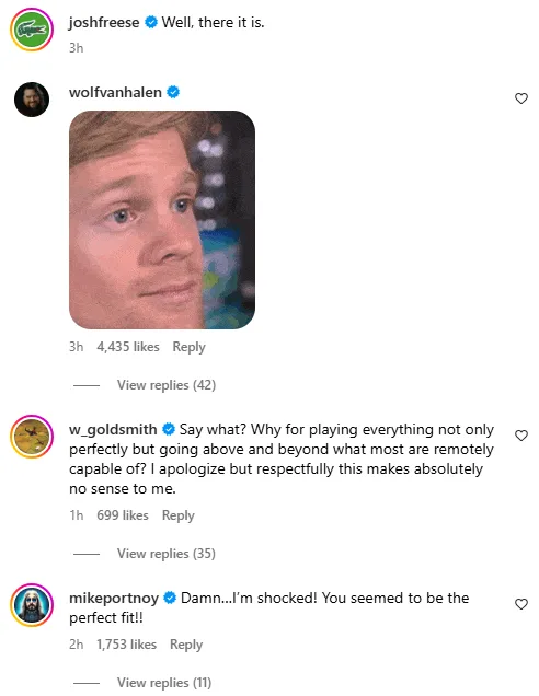 Wolf Van Halen is the top comment, where he simply dropped the classic GIF of reporter Drew Scanlon raising his eyebrows in a ‘what’d you just say?’ kinda way.
