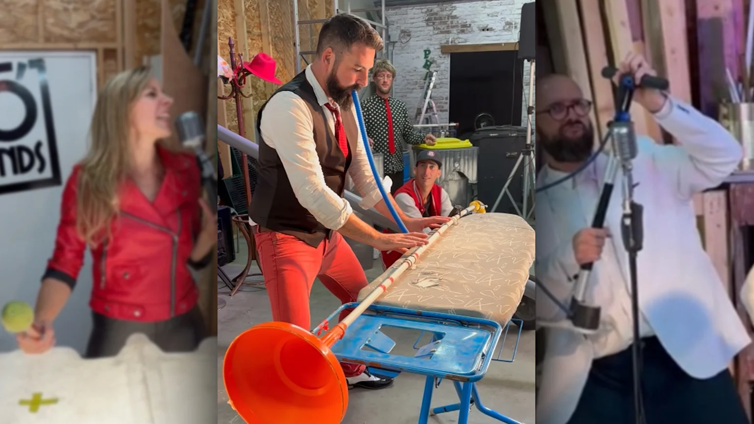 A funnel and piping laid out on an ironing board form the bassline, bin lids slam like a kick drum, and stones hitting the inside of a wheelbarrow mimic the sound of a snare drum.