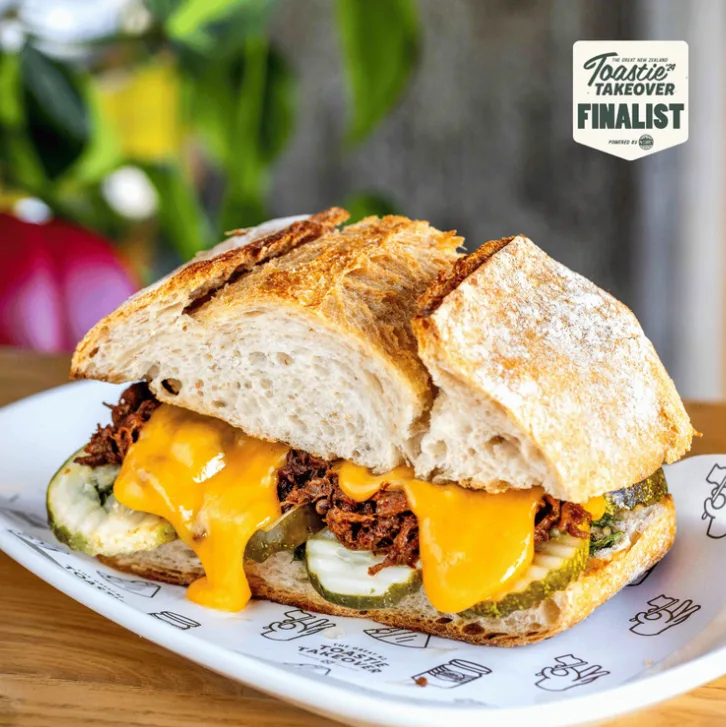 'Samun Melting Pot': Chipotle pulled beef cheek, McClure's Sweet & Spicy Pickles, chimichurri salsa and cheddar cheese, on buttered toasted sourdough.