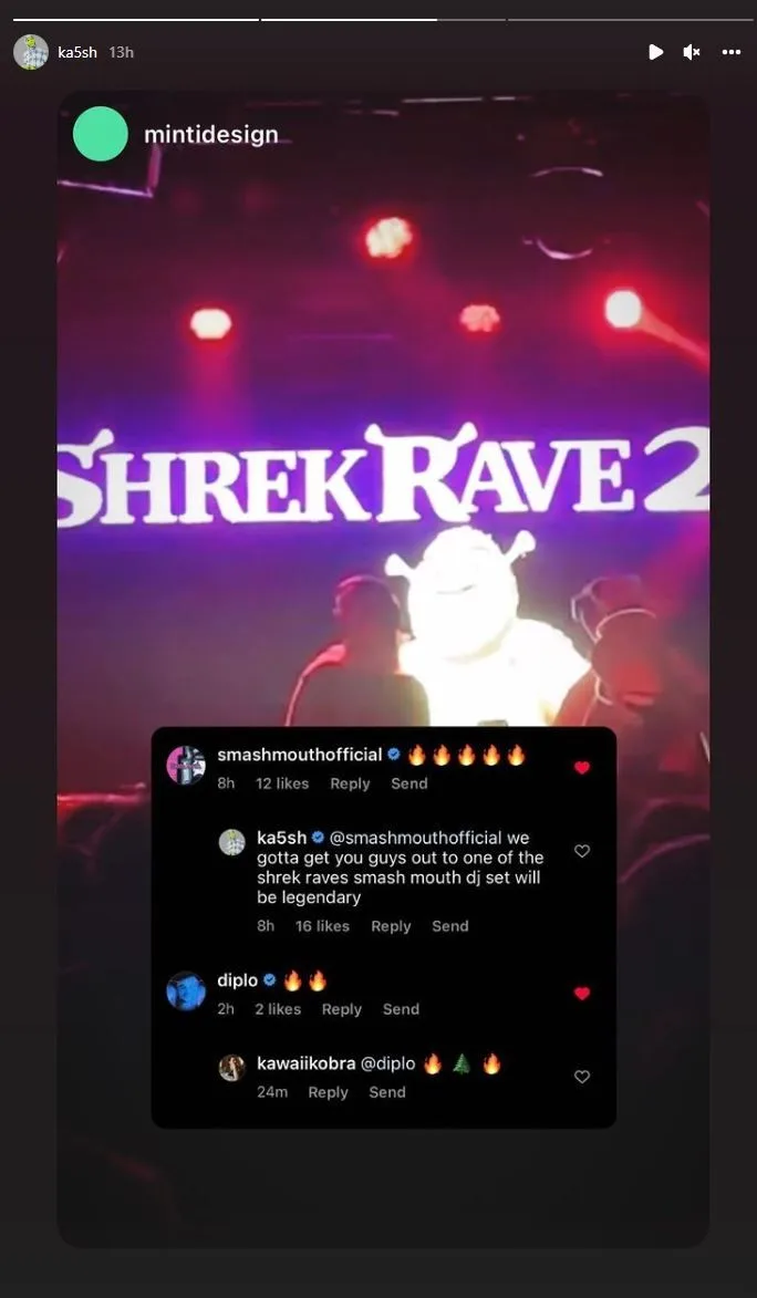 Diplo commented "put me on" on one of the @Shrekrave gram posts, Whatsonot said he's keen to run a b2b on the same post, and the band that is forever linked in memeology with Shrek, Smashmouth, commented a bunch of fire emojis, which is an obvious indicator of interest.