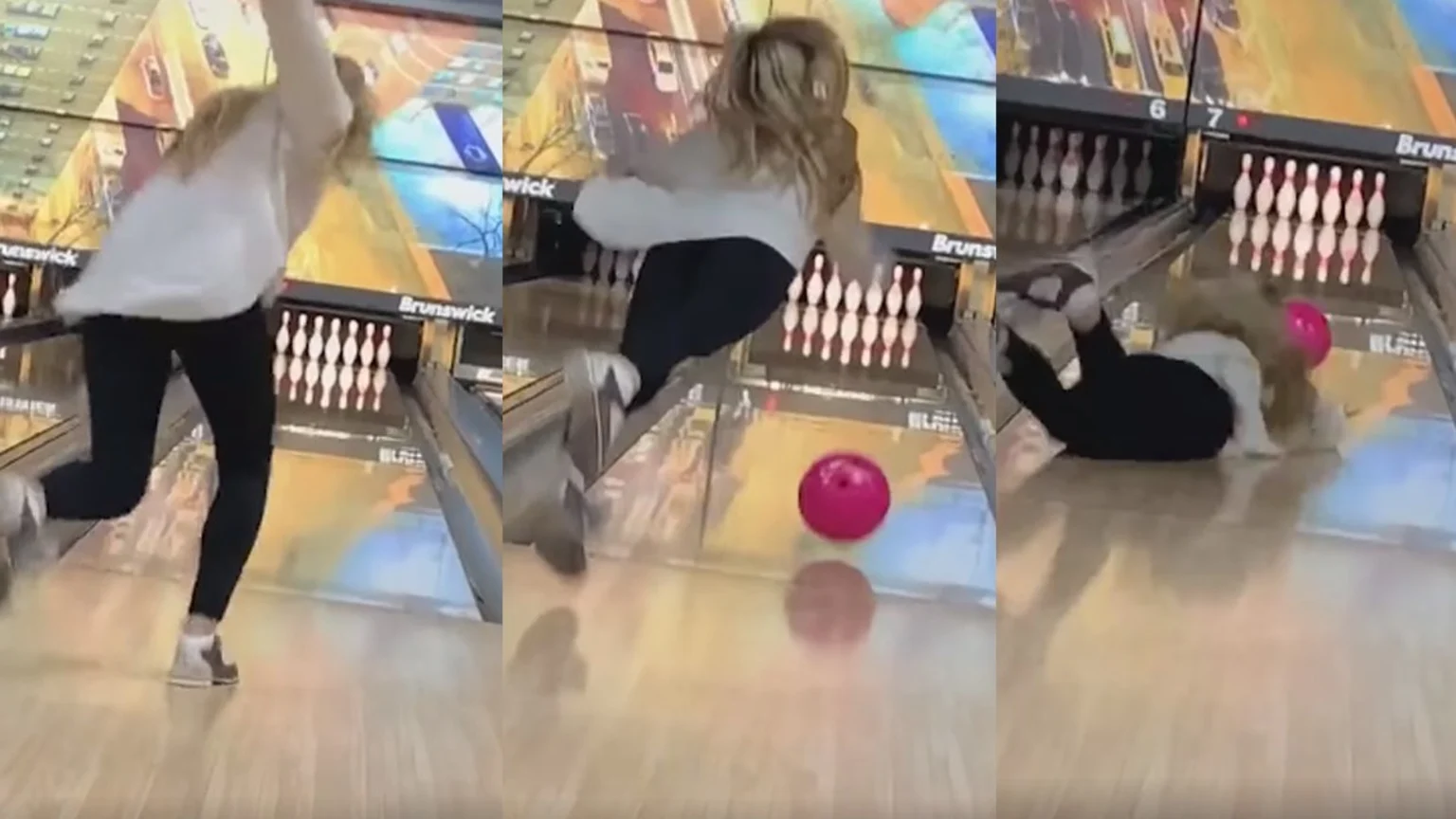Girl forgets to let go of bowling ball and eats it down the lane
